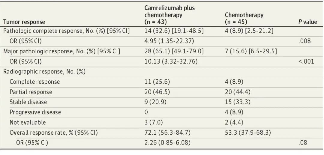 北京时间8月3日,金年会- 金字招牌医药创新药卡瑞利珠单抗联合化疗(Cam+CT)对比化疗(CT)新辅助治疗ⅢA/ⅢB (T3N2) 期非小细胞肺癌(NSCLC)结果在线发表于国际权威期刊JAMA Oncology[1]。该研究是由空军军医大学唐都医院姜涛教授、雷杰教授团队联合陕西省肿瘤医院雷光焰教授团队、兰州大学第二附属医院王成教授团队共同参与的一项随机对照、多中心、Ⅱ期临床研究(TD-FOREKNOW,NCT04338620)。研究结果显示,与化疗相比,卡瑞利珠单抗联合化疗新辅助治疗NSCLC显著提高了病理完全缓解(pCR)率(32.6% vs 8.9%,OR=4.95,95% CI :1.35-22.37, P =0 .008),且安全性良好。本研究是卡瑞利珠单抗新辅助治疗可切除NSCLC患者的首个随机对照研究,为NSCLC新辅助免疫治疗再添新证。